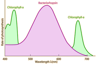 Current understanding is that the earliest photosynthetic organisms were aquatic bacteria, some of which are still around today. One of these, halobacterium halobium, grows in extremely salty water. It makes use of the bacteriorhodopsin pigment. The chlorophyll system developed to use the available light, as if it developed in strata below the purple bacteria and had to use what it could get.