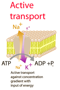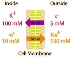 The process of moving sodium and potassium ions across the cell membrance is an active transport process involving the hydrolysis of ATP to provide the necessary energy. It involves an enzyme referred to as Na+/K+-ATPase. This process is responsible for maintaining the large excessof Na+ outside the cell and the large excess of K+ ions on the inside. A cycle of the transport process is sketched below. It accomplishes the transport of three Na+ to the outside of the cell and the transport of two K+ ions to the inside. This unbalanced charge transfer contributes to the separation of charge across the membrane. The sodium-potassium pump is an important contributer to action potential produced by nerve cells. This pump is called a P-type ion pump because the ATP interactions phosphorylates the transport protein and causes a change in its conformation. |
