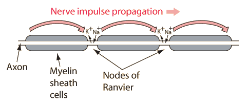 Transmission of a nerve impulse along an axon![]() A nerve cell is like a receiver, transmitter and transmission line with the task of passing a signal along from its dendrites to the axon terminal bundle. The stimulus triggers an action potential in the cell membrane of the nerve cell, and that action potential provides the stimulus for a neighboring segment of the cell membrane. When the propagating action potential reaches the axon, it proceeds down that "transmission line" by successive excitation of segments of the axon membrane. Just the successive stimulation of action potentials would result in slow signal transmission down the axon. The propagation speed is considerably increased by the action of the myelin sheath. ![]() The myelin sheath around the axon prevents the gates on that part of the axon from opening and exchanging their ions with the outside environment. There are gaps between the myelin sheath cells known as the Nodes of Ranvier. At those uncovered areas of the axon membrane, the ion exchange necessary for the production of an action potential can take place. The action potential at one node is sufficient to excite a response at the next node, so the nerve signal can propagate faster by these discrete jumps than by the continuous propagation of depolarization/repolarization along the membrane. This enhanced signal transmission is called saltatory conduction (from the Latin saltare, to jump or hop). Tuzynski and Dixon offer some quantification of the sizes involved in these nerve cells. The axon is made up of connected segments of length about 2 mm and diameter typically 20 mm. This diameter compares to about 100 mm for the diameter of a human hair. Axon diameters may vary from 0.1 mm to 20 mm and may be up to a meter long. The much-studied squid has a giant axon of about a millimeter in diameter. The myelin sheaths are about 1mm in length. The action potential travels along the axon at speeds from 1 to 100 m/s. Contributing author: Ka Xiong Charand |