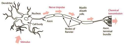 Nerve Cell![]() Many nerve cells are of the basic type illustrated above. Some kind of stimulus triggers an electric discharge of the cell which is analogous to the discharge of a capacitor. This produces an electrical pulse on the order of 50-70 millivolts called an action potential. The electrical impulse propagates down the fiber-like extension of the nerve cell (the axon). The speed of transmission depends upon the size of the fiber, but is on the order of tens of meters per second - not the speed of light transmission that occurs with electrical signals on wires. Once the signal reaches the axon terminal bundle, it may be transmitted to a neighboring nerve cell with the action of a chemical neurotransmitter. The dendrites serve as the stimulus receptors for the neuron, but they respond to a number of different types of stimuli. The neurons in the optic nerve respond to electrical stimuli sent by the cells of the retina. Other types of receptors respond to chemical neurotransmitters. The cell body contains the necessary structures for keeping the neuron functional. That includes the nucleus, mitochondria, and other organelles. Extending from the opposite side of the cell body is the long tubular extension called the axon. Surrounding the axon is the myelin sheath, which plays an important role in the rate of electrical transmission. At the terminal end of the axon is a branched structure with ends called synaptic knobs. From this structure chemical signals can be sent to neighboring neurons.