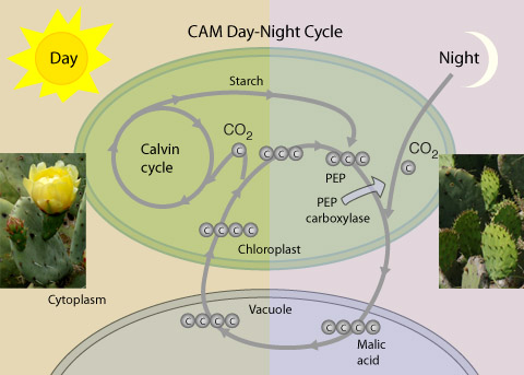 ![]() The acidity was found to arise from the opening of their stomata at night to take in CO2 and fix it into malic acid for storage in the large vacuoles of their photosynthetic cells. It could drop the pH to 4 with a malic acid concentration up to 0.3M . Then in the heat of the day, the stomata close tightly to conserve water and the malic acid is decarboxylated to release the CO2 for fixing by the Calvin cycle. PEP is used for the initial short-term carbon fixation as in the C4 plants, but the entire chain of reactions occurs in the same cell rather than handing off to a separate cell as with the C4 plants. In the CAM strategy, the processes are separated temporally, the initial CO2 fixation at night, and the malic acid to Calvin cycle part taking place during the day.