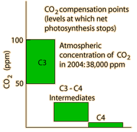 The connection to hot and dry conditions comes from the fact that all the plants will close their stomata in hot and dry weather to conserve moisture, and the continuing fixation of carbon from the air drops the CO2 dramatically from the atmospheric concentration of nominally 38,000 ppm. If the CO2 compensation point is lower on the above scale, the plant can operate in hotter and dryer conditions. The limits are placed by the fact that rubisco begins to fix oxygen rather than CO2, undoing the work of photosynthesis. C4 plants shield their rubisco from the oxygen, so can operate all the way down to essentially zero CO2 without the onset of photorespiration.