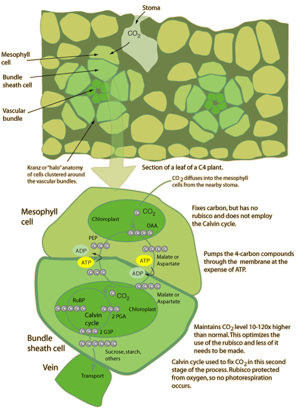 C4 plants almost never saturate with light and under hot, dry conditions much outperform C3 plants. They use a two-stage process were CO2 is fixed in thin-walled mesophyll cells to form a 4-carbon intermediate, typically malate (malic acid). The reaction involves phosphoenol pyruvate (PEP) which fixes CO2 in a reaction catalyzed by PEP-carboxylate. It forms oxaloacetic acid (OAA) which is quickly converted to malic acid. The 4-carbon acid is actively pumped across the cell membrane into a thick-walled bundle sheath cell where it is split to CO2 and a 3-carbon compound. This CO2 then enters the Calvin cycle in a chloroplast of the bundle sheath cell and produces G3P and subsequently sucrose, starch and other carbohydrates that enter the cells energy transport system. ![]() The advantage that comes from this two-stage process is that the active pumping of carbon into the bundle sheath cell and the blocking of oxygen produce an environment with 10-120x as much CO2 available to the Calvin cycle and the rubisco tends to be optimally utilized. The high CO2 concentration and the absence of oxygen implies that the system never experiences the detractive effects of photorespiration. The drawback to C4 photosynthesis is the extra energy in the form of ATP that is used to pump the 4-carbon acids to the bundle sheath cell and the pumping of the 3-carbon compound back to the mesophyll cell for conversion to PEP. This loss to the system is why C3 plants will outperform C4 plants if there is a lot of water and sun. The C4 plants make some of that energy back in the fact that the rubisco is optimally used and the plant has to spend less energy synthesizing rubisco. Moore, et al. say that only about 0.4% of the 260,000 known species of plants are C4 plants. But that small percentage includes the important food crops corn, sorghum, sugarcane and millet. Also inluded are crabgrass and bermuda. Many tropical grasses and sedges are C4 plants.
