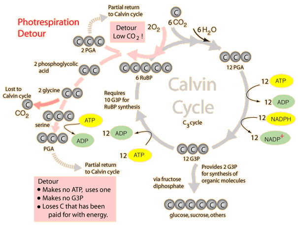PhotorespirationRespiration refers to the metabolism of oxygen and the release of carbon dioxide. In cellular respiration it is a positive term, a process vital to life. But photorespiration is an entirely negative term because it represents a severe loss to the process of using light energy in photosynthetic organisms to fix carbon for subsequent carbohydrate synthesis. By leading to the loss of up to half of the carbon that has been fixed at the expense of light energy, photorespiration undoes the work of photosynthesis. Photorespiration happens in C3 plants when the CO2 concentration drops to about 50 ppm. The key enzyme that accomplishes the fixing of carbon is rubisco, and at low concentrations of CO2 it begins to fix oxygen instead. ![]() Under moderate temperature conditions when C3 plants have sufficient water, the supply of carbon dioxide is abundant and photorespiration is not a problem. The CO2 concentration of the atmosphere as of 2004 was about 38,000 ppm and this CO2 freely diffuses through the stomata of leaves and across the membranes of the chloroplasts while water diffuses out through the stomata. But during hot and dry conditions, the stomata close to prevent excessive water loss and the continuing fixation of carbon in the Calvin cycle dramatically reduces the relative concentration of CO2. When it reaches a critical level of about 50 ppm the rubisco stops fixing CO2 and begins to fix O2 instead. Even though the detoured process feeds some PGA back into the cycle, the photorespiration process causes rubisco to operate at only about 25% of its optimal rate. The C4 plants and CAM plants avoid photorespiration and therefore operate at much higher efficiencies in hot and dry climates.