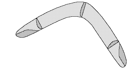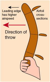 Boomerang StructureThe structure of a boomerang is such that each end forms an airfoil heading into the wind when it is at the top of its motion. Therefore the sideways "lift" force is always greater on the top of the spinning structure.![]() A boomerang is an example of gyroscopic precession. The throw of the boomerang gives it an angular velocity perpendicular to its path. The cross-section of the boomerang is an airfoil which gives it more lift on the top, leading edge than on the bottom. This gives it a torque , which always acts to precess the boomerang counterclockwise as seen from above. Since it will tend to "fly" in the direction of the airfoil, the precession causes it to fly in a curved path, circling back toward the thrower. |