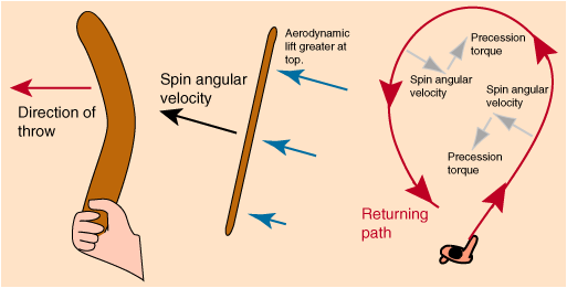 Boomerang as Vector Rotation ExampleThe returning trajectory of a boomerang involves the aerodynamic lift of its airfoil shape plus the gyroscopic precession associated with its rapid spin. The precession redirects the airfoil so that it "flys" around the returning path.
