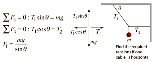 Force equilibrium problems like this can be analyzed by drawing a free body diagram of the point of attachment of the mass m, since it must be at equilibrium. The tensions should be resolved into horizontal and vertical components to apply the force equilibrium condition.