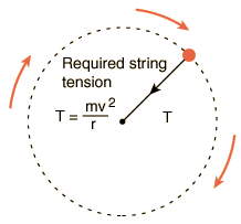 Swinging a mass on a string requires string tension, and the mass will travel off in a tangential straight line if the string breaks.