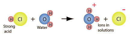 Acid StrengthAn acid which ionizes almost completely in solution is said to be a strong acid, wheras one which has a small degree of ionization is a weak acid. Of the common acids, hydrochloric acid, nitric acid and sulfuric acid are strong acids. Acetic acid is a weak acid. The acidity of solutions is measured in terms of the pH of the solution, and strong acids will lower the pH more for a given molarity of solution.