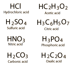 Common AcidsSome common molecules which are classified as acids. ![]()