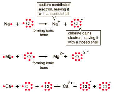 Ionic BondsIn chemical bonds, atoms can either transfer or share their valence electrons. In the extreme case where one or more atoms lose electrons and other atoms gain them in order to produce a noble gas electron configuration, the bond is called an ionic bond. Typical of ionic bonds are those in the alkali halides such as sodium chloride, NaCl.
