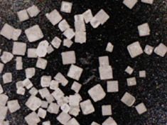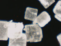 Sodium chloride is the most common salt, the common table salt used for the seasoning of food. The images above are grains of table salt from a salt shaker, taken at 50x and 200x. Those images show the tendency to form a cubic structure, a symmetry borne out in the atomic level structure of the salt crystals. It occurs commonly in the mineral form, halite, also called rocksalt.