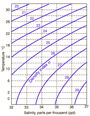 Seawater has an average density of 1.027 gm/cm3, but this varies with temperature and salinity over a range of about 1.020 to 1.029. The density is typically indicated by a density index s which is the departure of the density from 1.000 multiplied by a thousand. |