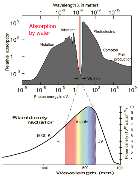Transparency of Water in the Visible RangeWater is strongly absorbing at most of the wavelengths in the electromagnetic spectrum, but it has a narrow window of transparency which includes the visible spectrum. The span of the absorption spectrum shown is from wavelengths on the order of a kilometer down to about the size of a proton, about 10-15 meters. It doesn't absorb in the wavelength range of visible light, roughly 400-700 nm, because there is no physical mechanism which produces transitions in that region - it is too energetic for the vibrations of the water molecule and below the energies needed to cause electronic transitions. ![]() The window of transparency of water matches the peak emitted intensity of a blackbody radiator at 6000 K, a reasonable model for the output radiation of the Sun. The absorption spectrum of water and the peak of the Sun's radiation are of course physically independent phenomena, but it is fortunate for life on the Earth that they coincide. Just above the visible in the ultraviolet, the absorption of water increases by nine orders of magnitude, adding to our protection against ultraviolet rays from the Sun. The absorption of electromagnetic radiation by water spans a wide range of physical phenomena, characteristic of the general interaction of radiation with matter. It absorbs strongly in the microwave region by excitation of molecular rotations. In the infrared it exhibits strong absorptions from vibrations of the water molecule. As you go above the visible through the UV toward x-rays, it successively absorbs by photoelectric effect, Compton scattering and finally pair production.