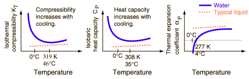 In general, molecular vibrational motion takes place on a shorter time scale than rotation, going through many cycles of vibration during a rotation period so that the bond lengths obtained from molecular rotation spectra are effective average bond lengths. The parameters of t he isolated water molecule above are altered significantly in liquid water and even more in hexagonal ice crystals. Water molecules have large dipole moments and the resulting hydrogen bonding in the liquid state alters the bond angle to something like 105.5 to 106° with a bond length around 0.097 nm. In hexagonal ice crystals, the bond angle approaches the tetrahedral angle, 109.47 °. In addition to all the molecular motions, in liquid water there is a continuous exchange of hydrogens between water molecules - about one exchange per millisecond at a neutral pH of 7.0 and more rapidly when the pH departs from neutrality. Water provides the standard for density at 1 gram/cm3. While water may seem to be an ordinary liquid, its properties are in many ways unusual. The changes in the properties of water near its freezing point are illustrated below with sketches adapted from Debenedetti and Stanley. The vertical scales are exaggerated for emphasis - the actual magnitudes of the changes are quite small. It is the contrast with the properties of other liquids which makes them remarkable. ![]()