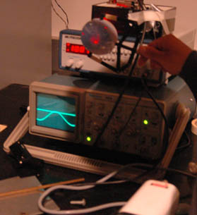The oscilloscope shows the signal from a photo-detector when the laser (white, lower right) is modulated by a 1 MHz signal from the signal generator. Pathlengths of 11.5 and 18.1 meters were used. Both gave velocities of about 2.3 x 108 m/s for c. The measured times were 0.05 and 0.08 microseconds for the two cases. |