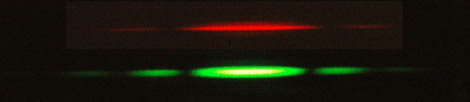 A helium-neon laser with standard wavelength 632.8 nm was used with a single slit to determine its width. With a distance of 1.94 meters from the wall, a distance of 0.029 meters from the maximum to first minimum was measured. This corresponds to a slit width of a = 42.2 micrometers by the single slit calculation. At the same screen distance, measurements of 0.0298 m for the red and 0.0244 for the green diode laser were made. These measurements correspond to 652nm and 532 nm for the red and green lasers respectively. Investigation with the double slit gave a slit separation of 2.0 x 10-4 m and 650nm and 530 nm for the red and green wavelengths respectively. Use of a 600 lines/mm diffraction grating gave 653nm and 531nm for the red and green.
