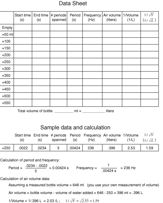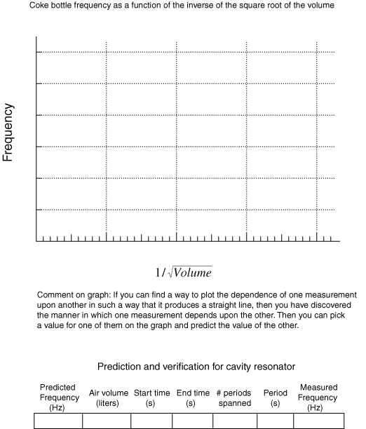Cavity ResonanceThe purpose of this experiment is to explore the resonant behavior of an acoustic cavity (a coke bottle). Recall that a resonant frequency is defined as a natural frequency of vibration which is determined by the physical properties of the vibrating object. In this case the physical properties which affect the natural frequency of the cavity are its volume, area of opening, and length of opening port. In this experiment, only the effects of changing volume will be explored since the other factors are not easily changed. The apparatus consists of a coke bottle, a graduated cylinder, and a digital computer interface with which to produce a digital image of the sound made by blowing over the coke bottle. Procedure: Setup of Computer Interface: 1. Double-click on the DataStudio icon to start the data collection software. 2. Scroll down the "Sensors" menu to "Sound Sensor" and click-and-drag t hat icon to the image of the port where your microphone is connected. Data Collection: 1. Click on "Scope" under the "Displays" menu to display an oscilloscope screen. Click the "Start" button and produce a sound to confirm that you can display a sound waveform. You may need to adjust the V/div(sensitivity) and/or Offset (vertical position) controls until get a satisfactory waveform with no clipping of the peaks. Experiment with starting and stopping the display. 2. Click the "Start" button and blow over the coke bottle close to the microphone, but do not blow directly on the microphone. Once you are producing a satisfactory waveform, click the "Stop" button to hold the display. You can repeat this part if you like to get a better waveform. 3. Click the data storage button to store that trace of the sound waveform. This button looks like pincers picking up a ball. Then double-click on "Graph" under the "Displays" menu to put a graph on the screen. Drag the icon for your data set over onto the graph to display it. It will appear cluttered with their cute symbols for data points, but you can clean it up by going to the Display/Settings and taking off the "Show data points" and "Show Legend Symbol" options. 4. Measure the time associated with the first clear peak on the waveform. Then move the cursor to the last clear peak to the right and record that time as "End Time". You can just read the numbers off the graph, or go Display/Measure to display a set of crosshairs on the screen to make measurements. Try both ways to see which you like best. Record the number of periods spanned and calculate the period and frequency of the wave. 5. Repeat the process after adding 50 ml (same as cm3) of water from a graduated cylinder. Continue adding water in 50 ml amounts and taking data until you have filled the coke bottle. Fill the bottle completely and determine the total volume of air so that you can work backwards to get the volume of air for each of your measurements. 6. Plot your data with frequency in Hz on the vertical axis and your column of one divided by the square root of volume on the horizontal axis. Prediction-verification: 7. Determine the value on the horizontal axis of your graph which corresponds to the frequency of middle-C (262 Hz). Calculate the corresponding air volume and add enough water to produce that air volume. 8. Take data as in steps 2-4 to determine the frequency of the cavity. ![]() ![]() |
