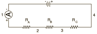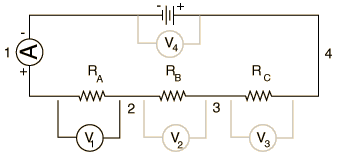 An ammeter will always be wired in series in a circuit. Failure to do this will result in blown fuses or damaged meters. Recall that the current has only one path to flow in a series connection, so the ammeter measures the current that flows through the circuit elements which are in series with it. The ammeters to be used will measure in milliamperes or 10-3 amperes. A voltmeter is always wired in parallel with the circuit elements it is testing and measures the voltage change across them. PROCEDURE: (Proper labeling of the circuit diagrams is part of your report.) A. Ohm's Law 1. Wire up the circuit as shown with the ammeter in place, observing the correct polarities. Set your meter selector switch for DC amperes and the range to the maximum. The "battery" in this case will be the round Flex Lab receptacles on your lab table which are connected to a DC power supply - DO NOT APPLY POWER until the circuit has been approved by the instructor. ![]() 2. After approval, apply power by connecting the wires to the DC receptacles and record the ammeter reading in milliamperes. Repeat the current measurement each of the other resistors by placing them in the circuit in place of the first one. 3. Disconnect the power leads and remove the ammeter from the circuit. Switch it to DC volts and connect it in parallel across the resistor. Reconnect the DC voltage and measure the voltage across the resistor. Repeat for the other resistors. 4. You now have voltage and current measurements for each resistor. Use Ohm's law to calculate the resistance for each resistor and compare the calculated value obtained from the labeling on the resistor or from the color code on the resistor. B. Distribution of Current. 1. Form the series circuit shown below. Since you will again be using the meter as an ammeter, reset its selector switch to DC amperes. Make sure it is correct before applying power. ![]() 2. Wire the ammeter successively in locations 1,2 3 and 4 and record the current value in each location. Note that conventional current is taken to be clockwise in this circuit, while the electrons will be circulating counterclockwise. What can you conclude about the current in a series circuit from your measurements? C. Distribution of Voltage The circuit wired in Part B will now be used to measure voltages. The connections illustrated below will be used, but since you will be using the same meter for an ammeter and a voltmeter, the ammeter will not be in place when you are measuring the voltages. ![]() 1. Measure the voltage across each resistor in turn and across the entire circuit, as indicated by V4. Record the results. 2. Compare the sum of voltages across the individual resistors to the voltage across the entire circuit. What can you conclude about the voltage in a series circuit? 3. Use the voltages across each resistor obtained in Step 1 above and the currents obtained from Section B above, along with Ohm's Law, to obtain values for the individual resistances. Compare the values with the given values for the resistors. 4. From the total voltage measured in Step 1 and the total current measured in Section B, calculate the equivalent resistance of the entire circuit composed of the three resistors in series. Compare this result with the sum RA + RB + RC. QUESTIONS: 1. What functions does a wire serve? Are there insulators associated with your apparatus? What do they do? 2. What, if anything, flows through the wires? 3. Why must there be two connections to a battery and to a light bulb? 4. If you have a 120 volt appliance and 2 amperes of current flow through it, what is the power used by it in watts? What is its resistance in ohms? 5. Why are your household receptacles wired in parallel rather than in series? |
