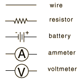 II. Quantitative investigation of voltage, current, and Ohm's law. Electric current is the flowrate of electric charge and is measured in amperes. The current transports electrical energy along conductors. Voltage (V) is a measure of energy per unit charge between two points in the circuit. One may think of voltage as the effective "pressure difference" which causes the current to flow. Resistance (R) is the opposition to current flow and is measured in ohms. In practice, resistors take the form of light bulbs, toasters, heaters and other devices which use electrical energy to perform useful tasks as well as the undesirable form of resistance in electrical wiring that transports the electrical energy to you. Ohm's Law will be utilized in this laboratory exercise to determine the voltage, current, or resistance in a circuit. Ohm's law simply states that the current in a circuit is directly proportional to the voltage and inversely proportional to the resistance in the circuit: or in symbol form .Symbols and instrumentation: The following symbols will be used in the circuit diagrams.