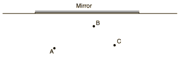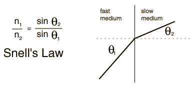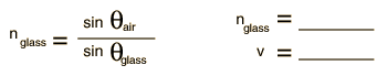 Reflection and RefractionWhen the phrase "ray of light" is used, it often means the same as "line of sight". In this lab, the "laws" of reflection and refraction are to be studied by using the equivalence of these two ideas. A. Reflection of Light from a Mirror Tape a plain sheet of paper to the piece of cardboard supplied. Draw a line across the center of the paper and place the mirror along this line. Support the mirror by fastening it to a wooden block. Try to keep the mirror line from moving during the experiment. Place a pin A about 3 inches in front and toward one side of the mirror. Place a second pin B about an inch from the mirror near the center of the page. Sighting along the table top, place a third pin C so that it lines up with both the second pin and the mirror image of the first pin (see diagram). These pins define the line of sight or light ray in this case. ![]() Remove the pins and mirror, draw in the rays, measure and record the angles. What is your conclusion? Repeat the above procedure using a different position for the pins to get a new set of data. B. Refraction Start with a new, plain sheet of paper taped to the cardboard and make a set of perpendicular lines that cross near the center of the page. Place one pin O at the crossing point of the lines and place the glass cube or plate against this line with one side placed along the line . Carefully trace the glass block or plate on your paper. Now place a second pin A above and to the left of the first and a third pin B against the glass and in line with the first two as seen looking through the glass. Finally, place a fourth pin C on the viewing side of the glass, in line with pin B and the images of the other pins seen through the glass. Remove the glass and pins and draw the path taken by the ray of light. Measure the angles of the incoming ray and the ray in the glass. It is standard practice to measure ray angles with respect to the normal (the perpendicular line to the entrance surface). With a protractor, measure the angles of the incoming ray and the ray you have drawn through the glass. The index of refraction of a material is defined by n = c/v where c is the velocity of light in vacuum (3 x 108 m/sec) and v is the velocity in the medium. When light is refracted at a surface, the angles of the incident and refracted rays are related by Snell's law: Since the index of refraction of air is almost one (nair = 1.00028), the index of refraction of the glass can be determined by ![]() Using a calculator or computer to determine the sines of the angles you have measured, compute the index of refraction of the glass and the speed of light in that glass. ![]() You will be provided with a prism which has two edges clear and one edge frosted (the base of the prism). Draw a line across a sheet of paper, place the base of the prism along this line, and carefully trace it on the paper. Place a pin A in the position shown in the figure. Sighting past A and through the prism, place another pin B about three inches from the opposite side of the prism where you can see it and line it up with A. Place a third pin C closer to the prism on the same side as B so that all three pins line up when viewed through the glass. Finally place a fourth pin on the viewing side to define the ray coming to your eye from the prism. Remove the pins and prism and draw the paths of the light rays. ![]() Equipment: Reflection and Refraction