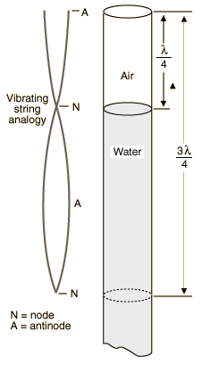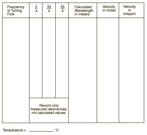 Procedure: 1. Fill the tube nearly full of water. Strike one of the tuning forks with the rubber mallet supplied and hold it above the water column. Caution: do not touch the tube with the tuning fork - the rapidly moving fork can break the plastic. 2. Using the moveable water reservoir, lower the water surface slowly, listening for amplification of the tone. When a resonance is found, a pronounced reinforcement of the sound will be heard. Move the water surface up and down several times to locate the point of maximum sound intensity and mark that point with a rubber band on the outside of the tube. 3. Lower the water further to find the next resonant length. Continue in this manner as far as the length of the tube will permit. Obtain the lengths l/4, 3l/4, etc. in meters from your measurements. You will need to check to see if your column lengths follow the progression 1, 3, 5, 7, -- since you may have missed a resonance or counted one of the fainter spurious resonances which sometimes occur. Calculate the wavelength and velocity of sound. 4. Repeat the procedure for the other tuning forks supplied. The velocity in miles per hour may be found by multiplying the velocity in m/sec by the factor 2.24. Please record the room temperature for reference since the velocity of sound increases with increasing air temperature. ![]() Equipment: Resonance Tube