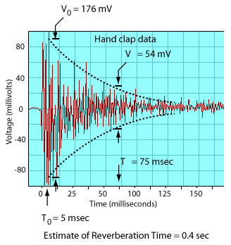 The reverberation time of an auditorium or a room is usually defined as the time required to drop 60 decibels below the initial level. The decay of a sharp sound like a hand clap or a finger snap will produce a reverberant decay in the room which can be approximated by an exponential curve. This reverberant decay can be observed by using a microphone with the laboratory interfaces, and measurements of voltage from the microphone at different times can be used to estimate the reverberation time of the room.
