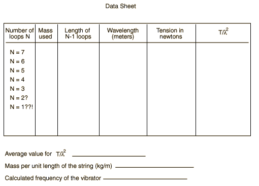 Procedure 1. Attach the string to the vibrator and add weights to the weight holder until a distinct standing wave with about six loops is produced (or as many loops as possible). If the weights available are not small enough for the fine adjustment, a small movement of the pulley toward or away from the vibrator may accomplish the desired result. For best accuracy, make small adjustments in the tension to get the maximum amplitude of vibration. 2. Omitting the loop nearest the vibrator, measure and record the total length of the remaining loops. Record the number of loops and the stretching force 3. Keep the distance between the pulley and the vibrator the same, except for small adjustments, and increase the stretching force until a distinct standing wave is produced with one less loop. Again measure the loops and record the data as in step 2. 4. Continue the process of reducing the number of loops by one until you have added enough to produce only two loops. Record all data as before. 5. Compare the wavelength for each of the trials. 6. Convert the stretching force to newtons by multiplying the mass in kilograms by the acceleration of gravity, g = 9.8 m/sec2. 7. Average the values of T/l2 which you obtained for the different loop patterns to get one value for T/l2. 8. From equation (3), T/l2 = mf2. The mass per unit length, m, will be given to you. Calculate f2, the frequency squared, and take the square root to get the frequency of vibration of the string. Equipment: String Resonance