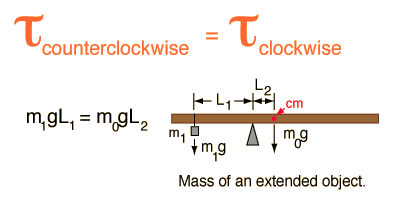 Determining the Mass of an Extended Oject The mass of an extended object can be found by using the conditions for equilibrium of torques. If the object is first balanced to find its center of mass, then the entire weight of the object can be considered to act at that center of mass. If the object is then shifted a measured distance away from the center of mass and again balanced by