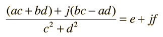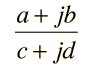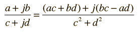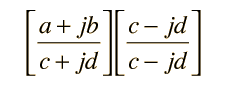 Rationalization of Complex NumbersThe division of complex numbers which are expressed in cartesian form is facilitated by a process called rationalization. The formation of a fraction ![]() presents difficulties because of the imaginary part of the denominator. The denominator can be forced to be real by multiplying both numerator and denominator by the conjugate of the denominator. ![]() Expanding puts the result of the division in cartesian form again. ![]() Calculation for multiplication and division |