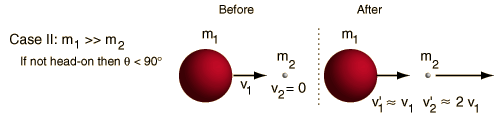 Elastic Collision, Massive ProjectileIn a head-on elastic collision where the projectile is much more massive than the target, the velocity of the target particle after the collision will be about twice that of the projectile and the projectile velocity will be essentially unchanged.![]() For non-head-on collisions, the angle between projectile and target is always less than 90 degrees. This was important in the analysis of the original Rutherford scattering experiment. This case implies that a train moving at 60 miles/hr which hits a small rock on the track could send that rock forward at 120 miles/hr if the collision were head-on and perfectly elastic. It also implies that if the speed of the head of your golf club is 110 miles/hr, the limiting speed on the golf ball off the tee is 220 miles/hr in the ideal case. That is, the limiting speed of the ball depends strictly on the clubhead speed, and not on how much muscle power you put into the swing.