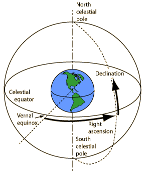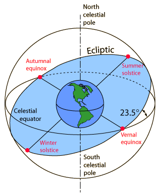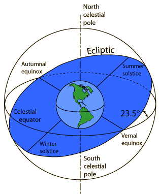 In order to know where to look in the sky for a given object, a precise description of the Earth's motion around the sun and precise measurement of time are necessary. It is often more convenient to describe the apparent motion of sun and stars with respect to the Earth as if it were fixed. In the Earth's frame of reference, the Sun's apparent path is called the ecliptic. The ecliptic plane is inclined at 23.5° with respect to the celestial equator because of the tilt of the Earth's rotation axis with respect to the plane of its orbit around the sun. |