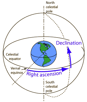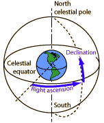 Right ascension is a celestial longitude measured in the direction of the Earth's rotation. Since that rotation makes a complete circle in 24 hours, the notation adopted for right ascension was in terms of hours and minutes with 24 hours representing the full circle. Declination is expressed as an angle with respect to the celestial equator. For example, the celestial coordinates of the star Betelgeuse in the constellation Orion are right ascension = 5 hours 52 minutes and the declination is 7 degrees 24 minutes. A declination south of the celestial equator is given a negative sign. |