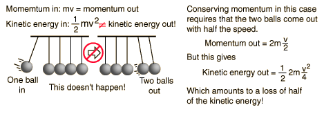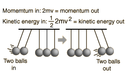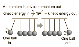 Swinging BallsA popular demonstration of conservation of momentum and conservation of energy features several polished steel balls hung in a straight line in contact with each other. If one is pulled back and allowed to strike the line, one ball flies out the other end. If two balls are sent in, two come out, and so forth.