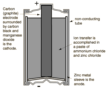 Some of the complexity of this reaction comes from the fact that the reduction of the ammonium ion produces two gaseous products 2NH4+(aq) + 2e- -> 2NH3(g) + H2(g) which must be absorbed to prevent the buildup of gas pressure. That is accomplished with two further reactions in the paste electrolyte. Zinc chloride reacts with ammonia to form solid zinc ammonium chloride and manganese dioxide reacts with hydrogen to form solid dimanganese trioxide plus water (Hewitt). ZnCl2(aq) + 2NH3(g) -> Zn(NH3)2Cl2(s) 2MnO2(s) + H2(g) -> Mn2O3(s) + H2O(l) The voltage of this cell is initially about 1.5 volts, but decreases as energy is taken from the cell. It also has a short shelf life and deteriorates rapidly in cold weather. Oxidation of the zinc wall eventually causes the contents to leak out, so such batteries should not be left in electric equipment for long periods. While these batteries have a long history of usefulness, they are declining in application since some of their problems are overcome in alkaline batteries.