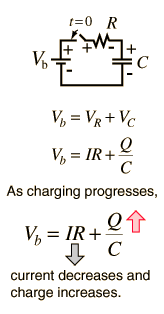 The transient behavior of a circuit with a battery, a resistor and a capacitor is governed by Ohm's law, the voltage law and the definition of capacitance. Development of the capacitor charging relationship requires calculus methods and involves a differential equation. For continuously varying charge the current is defined by a derivative