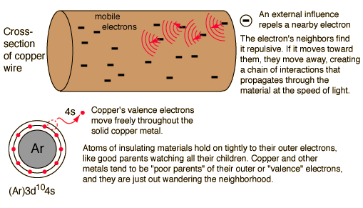 Conductors and Insulators![]() In a conductor, electric current can flow freely, in an insulator it cannot. Metals such as copper typify conductors, while most non-metallic solids are said to be good insulators, having extremely high resistance to the flow of charge through them. "Conductor" implies that the outer electrons of the atoms are loosely bound and free to move through the material. Most atoms hold on to their electrons tightly and are insulators. In copper, the valence electrons are essentially free and strongly repel each other. Any external influence which moves one of them will cause a repulsion of other electrons which propagates, "domino fashion" through the conductor. Simply stated, most metals are good electrical conductors, most nonmetals are not. Metals are also generally good heat conductors while nonmetals are not.