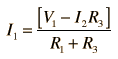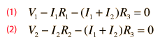 the current law. This approach requires two simultaneous equations formed by applying the voltage law to both loops. Taking the loops in the directions shown means that the sum of the currents flows through the middle resistor. Putting polarities on each component helps to keep the signs straight. The two loop equations are: