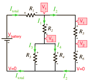 The equivalent resistance is Requivalent = Ω. If the battery voltage is VB = V then the total current is Itotal = A. Having found the equivalent resistance and current, the circuit can now be completely analyzed, specifying current and voltage at any point in the circuit. With repeated applications of the voltage law, current law and Ohm's law, the voltages at the indicated voltage probe points are