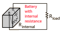 When a battery fails, it is typically because it has built up enough internal resistance that it can no longer supply a useful amount of power to an external load. If you measure the voltage of a failed battery which is disconnected, you will usually find that it has a nearly normal voltage, so that a voltmeter is not a useful tool to judge the degree of life left in a battery. If you connect the battery to an external resistance, then you will find that the terminal voltage of the battery drops; this can be interpreted as dropping most of its voltage across its internal resistance so that it is not available for external service. The following example allows you to explore the effects of internal resistance.