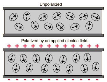 If a material contains polar molecules, they will generally be in random orientations when no electric field is applied. An applied electric field will polarize the material by orienting the dipole moments of polar molecules.