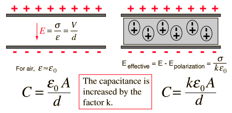 When a dielectric is placed between charged plates, the polarization of the medium produces an electric field opposing the field of the charges on the plate. The dielectric constant k is defined to reflect the amount of reduction of effective electric field as shown below. The permittivity is a characteristic of space, and the relative permittivity or "dielectric constant" is a way to characterize the reduction in effective field because of the polarization of the dielectric. The capacitance of the parallel plate arrangement is increased by factor k.