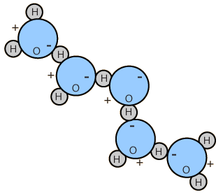This is 0.0039 nm compares with about .05 nm for the first Bohr radius of a hydrogen atom and about .15 nm for the effective radius of hydrogen in liquid form, so the charge separation is small compared to an atomic radius. The polar nature of water molecules allows them to bond to each other in groups and is associated with the high surface tension of water. |