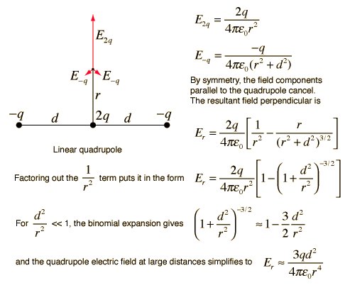 Linear Electric QuadrupoleA linear electric quadrupole can be created by superimposing two electric dipoles of opposite orientation so that their positive charges overlap. This case can be treated analytically and gives some insights into the nature of quadrupole fields. The electric field from any collection of charges can be obtained from Coulomb's law by vector addition of the fields from the individual charge elements. ![]() This has shown that the distant electric field perpendicular to the quadrupole drops off like 1/r4. This 1/r4 dependence applies to other directions as well. In fact, it is characteristic of quadrupoles in general, although we have not shown that here. It is also a general characteristic of quadrupoles that the electric field depends upon the magnitude of one of the charges times the square of the dimension of the quadrupole, qd2.
