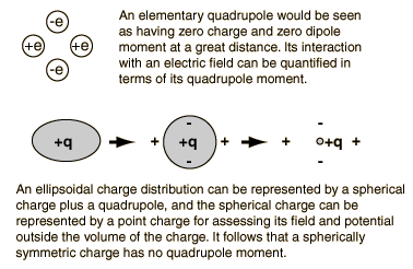 Electric QuadrupoleA general distribution of electric charge may be characterized by its net charge, by its dipole moment, its quadrupole moment and higher order moments. An elementary quadrupole can be represented as two dipoles oriented antiparallel. ![]() One of the most common uses of the electric quadrupole is in the characterization of nuclei. The nucleus has charge, but not dipole moment since it is all positive. But if the nucleus is not spherically symmetric, it will have a quadrupole moment. Quadrupole and higher order multipoles are not important for the characteriztion of dielectric materials. Dipole fields are much smaller than the fields of isolated charges, but in dielectrics where there are no free charges, the dipole effects are dominant. There is no such circumstance favoring the quadrupole effects, since they must arise from the same number of molecules as the dipole effects. Scott says that the macroscopic quadrupole effects are smaller than dipole effects by about the ratio of atomic dimensions to the distances of experimental observation.