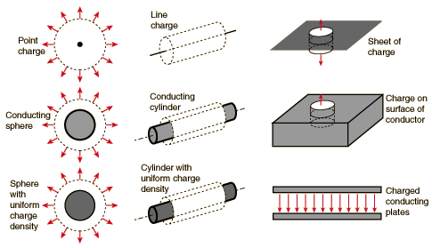 Applications of Gauss' LawGauss' law is a powerful tool for the calculation of electric fields when they originate from charge distributions of sufficient symmetry to apply it. ![]()