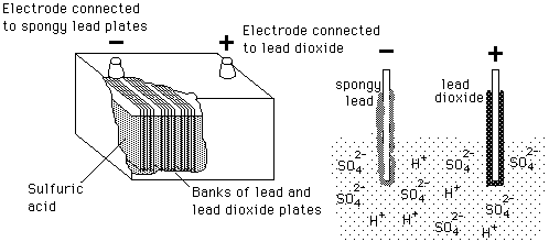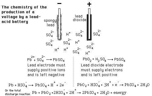 Lead-Acid BatteryThe reaction of lead and lead oxide with the sulfuric acid electrolyte produces a voltage. The supplying of energy to and external resistance discharges the battery. ![]()