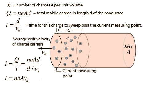 Microscopic Electric CurrentSince electric charge is quantized in discrete multiples of the electron charge, it is instructive to look at electric current as the movement of multiple microscopic charge carriers with a drift velocity in a conductor. ![]()