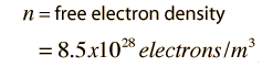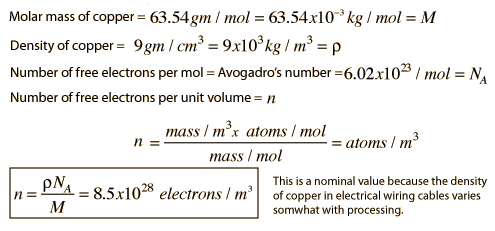 Density of Charge CarriersCalculation of the density of free electrons in a metal like copper involves the basic physical data about the metal, plus the fact that copper provides about one free electron per atom to the electrical conduction process. A representative value can be calculated with the following data. ![]()
