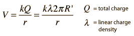 Potential of Line ChargeThe potential of a line of charge can be found by superposing the point charge potentials of infinitesmal charge elements. It is an example of a continuous charge distribution. ![]()